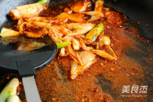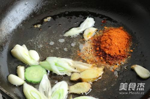 6炒锅加油爆香葱姜,加入麻辣香锅底料继续炒。