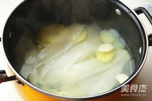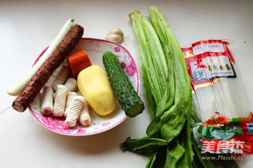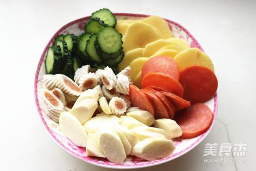 5汤锅加水烧开,放入土豆片和山药片煮1分钟,再加入粉皮煮软,然后捞出来沥干水分待用。