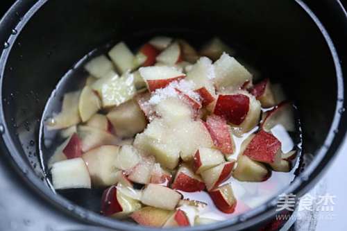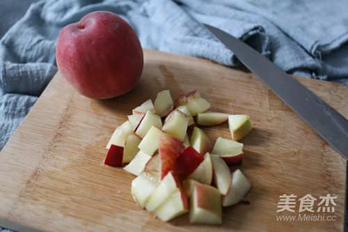 6将桃丁放入热水锅,加入糖,煮10分钟后捞出备用