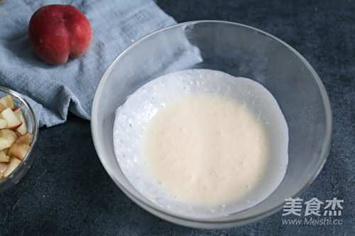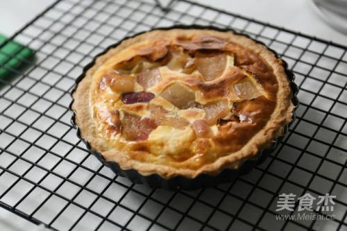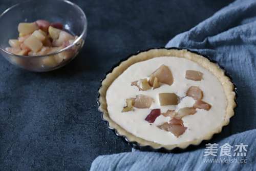 8奶酪糊倒入派中,加入桃丁,烤箱预热180度烤20分钟即可END