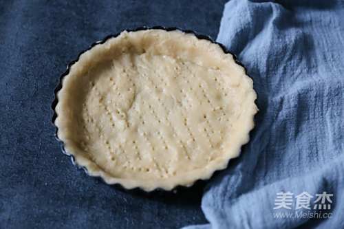 7拿出派皮,擀平后铺在模具中,让边缘平整(可以借助擀面杖),在底部戳几个洞