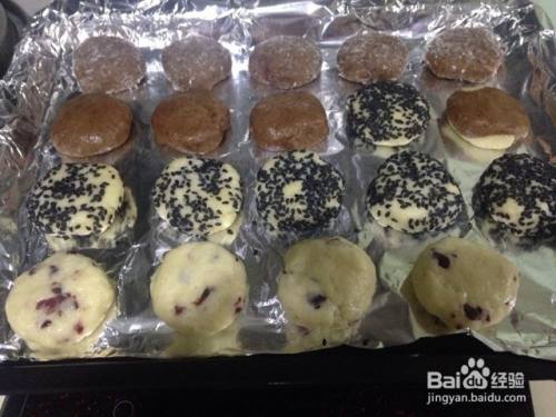 可可面团,每个分成20克,揉成圆团,稍微压扁,摆入烤盘中。有些滚了些椰蓉。