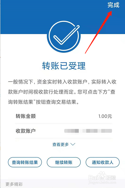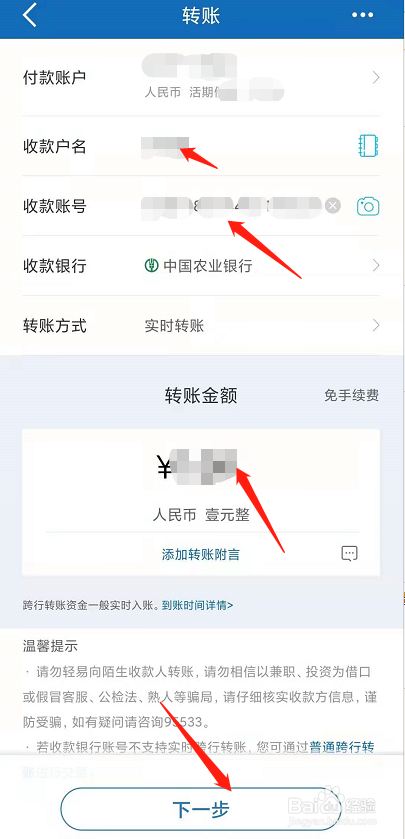 输入收款户名、账号、收款银行和转账方式及转账金额,点击下一步。