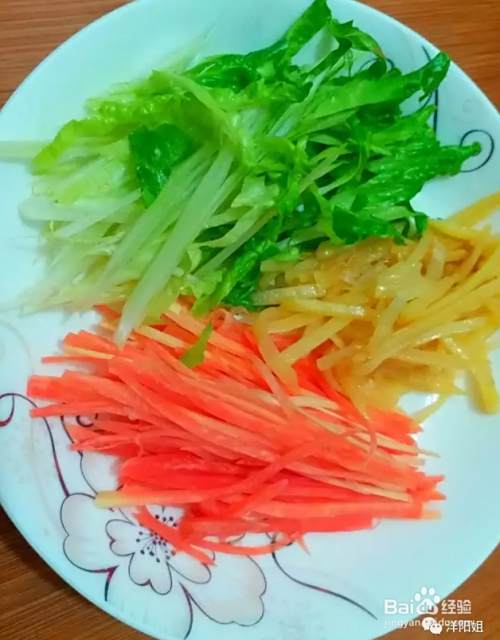 在等的时间里面洗需要的食材,土豆胡萝卜切丝,土豆丝用清水洗过后,炒熟。加上盐,调味。生菜,胡萝卜是生的。