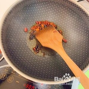 锅里油热了先下花椒和干辣椒,但是因为我找花椒和拍照耽误了时间,干辣椒就黑了,正常是炒一下马上进行下一步。