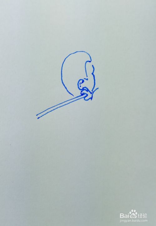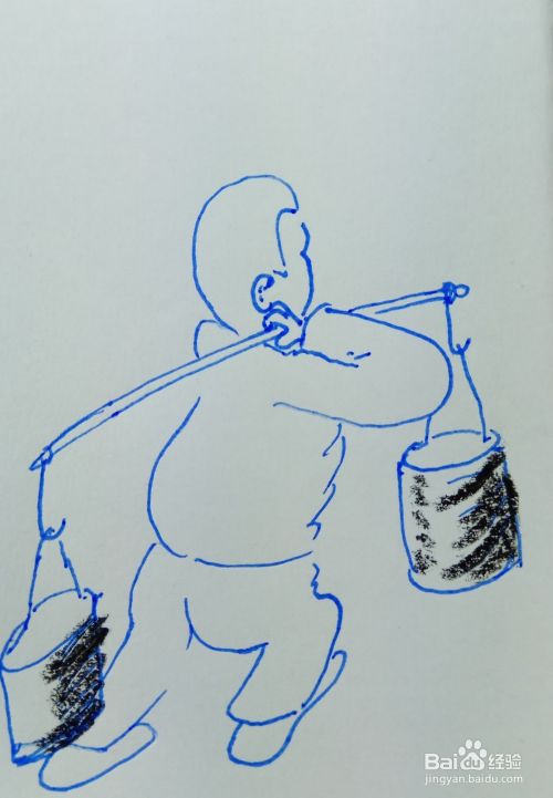 然后再用线条和曲线画出他的身体和胳膊部分,画出他肩膀上的一个扁担。