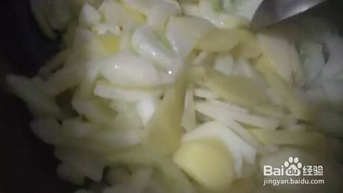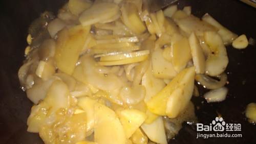 用蒜末爆香,放入土豆片和老黄瓜片翻炒至土豆片变软。