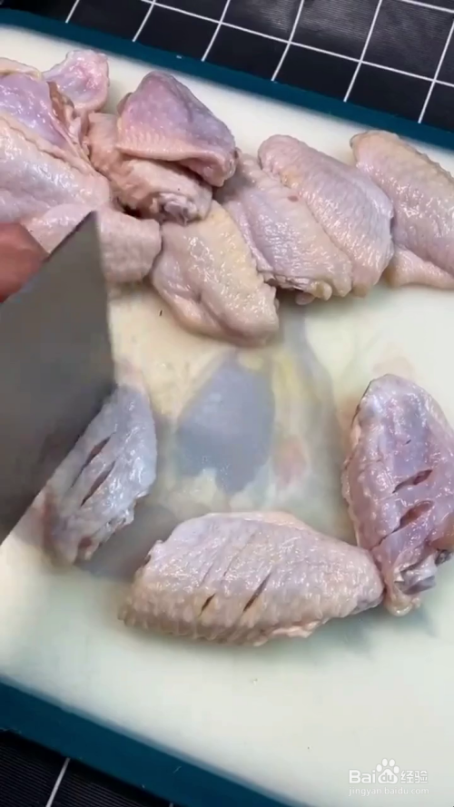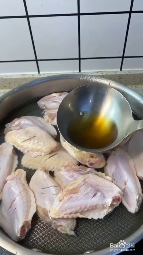 我们将鸡翅洗净改花刀,冷水下锅,加入料酒煮出血沫后捞出洗净控干水分,锅中烧油,油热下入鸡翅,煎至两面金黄