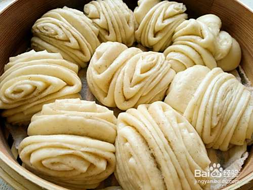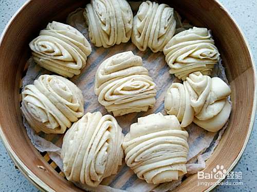 全部完成了,间隔一定距离,摆放到笼屉里醒发30分钟左右,这是醒发好的照片,花卷生胚膨胀间隙变小,摁下边缘柔软有弹性,用手掂一下感觉比原来轻了好多就可以开始蒸了。那个不怎么漂亮的花卷是用切下的两头摁在一起做的。
