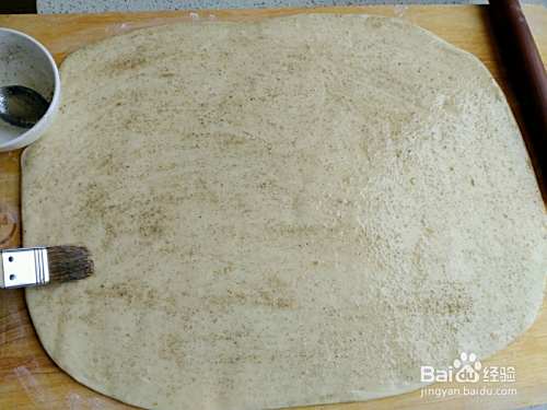 面团擀成厚度约5毫米的大长方形,淋上椒盐油,用刷子刷开抹匀。