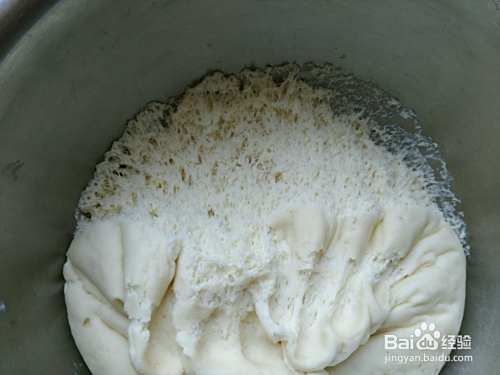 面团发酵至两倍大,用手摁下不回缩,扒开可以看到密密的蜂窝丝。