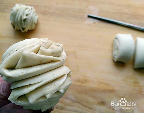 再用手把两边朝下捏紧在一起,一个小花卷就做好了,不难吧,其它的依次类推,开始切掉的两头也可以做一个。