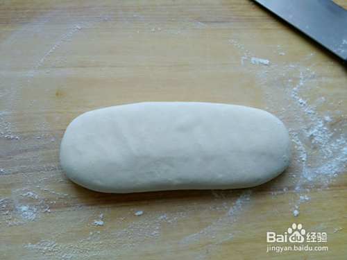 取出发酵好的面团,充分揉匀排气至切面无明显气孔,搓成粗条状,摁扁。