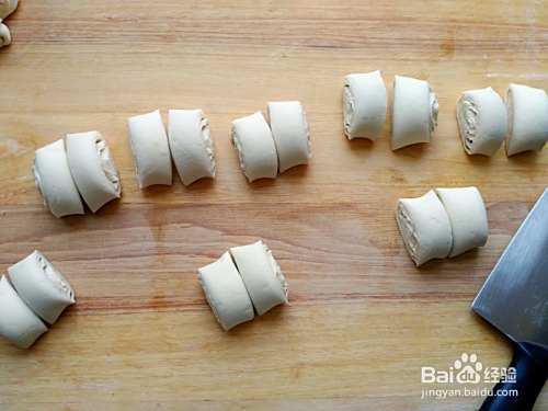 从长的一边开始卷起来,切掉两头,用快刀等分成8快,每一块再从中间切开。
