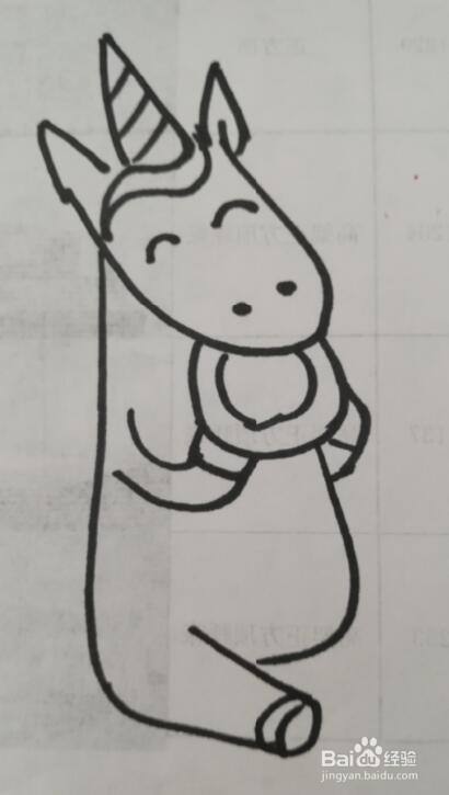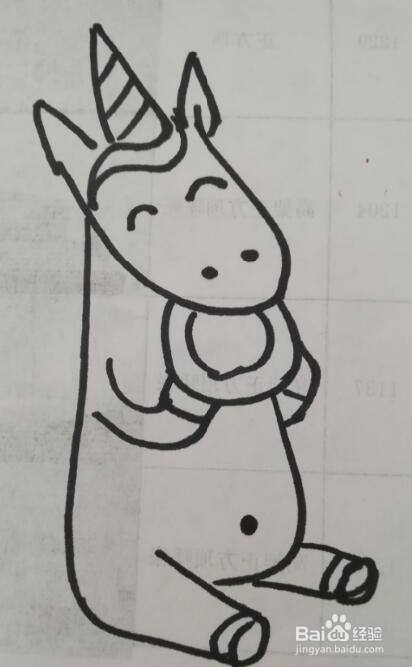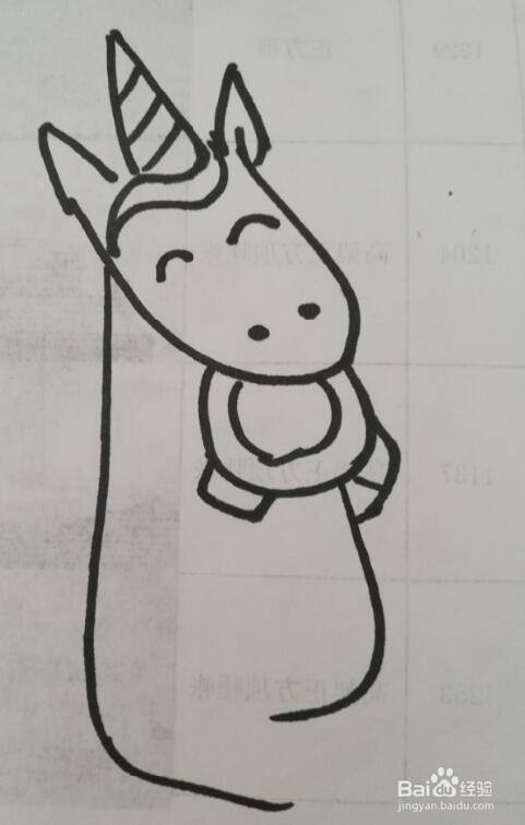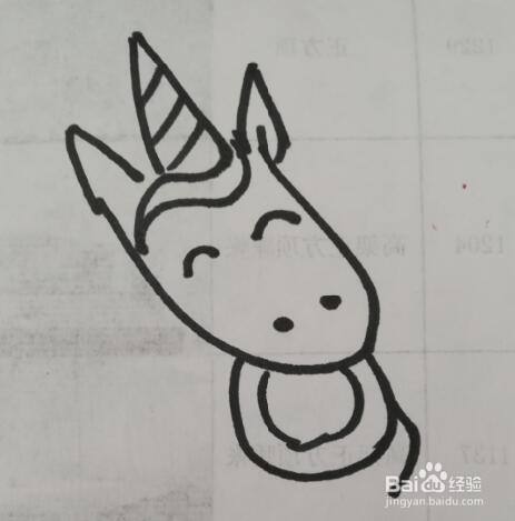 第二步,如图所示,画出独角兽的耳朵和眼睛
