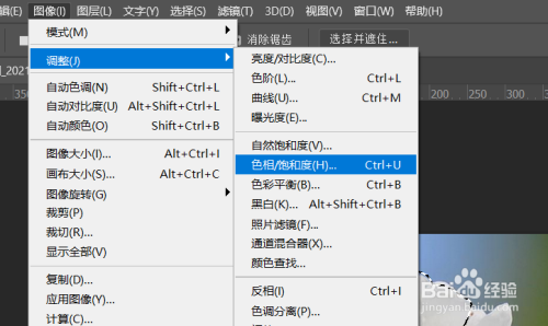 点击菜单栏的图像,调整,色相/饱和度按钮。