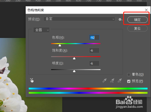 打开色相/饱和度对话框,调整颜色,点击确定按钮。