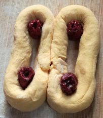 两个圆圈并排放在一起,注意接口朝内,放上四颗红枣。