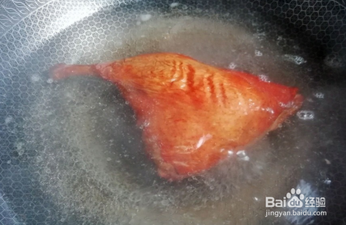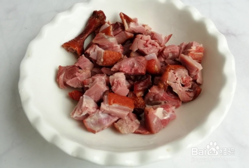 再用热水把腊鸭腿清洗一遍,剁成小块