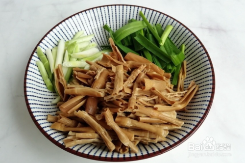 小笋干放入锅中,大火煮10分钟,清洗干净,挤干水分,切成小段。蒜苗清洗干净,切成小段