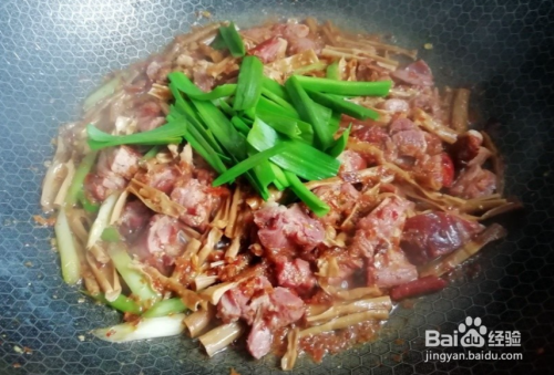 加入盐、生抽、料酒、干辣椒面炒匀,倒入适量清水煮8分钟,放入大蒜叶子,翻炒几下,即可出锅享用