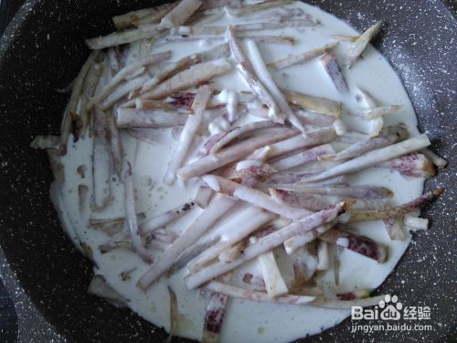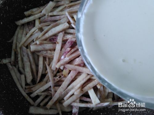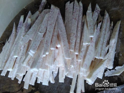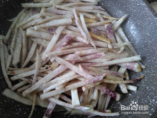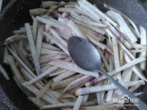 开火下油,放香芋丝进锅,撒适量的盐花下去翻炒一下。