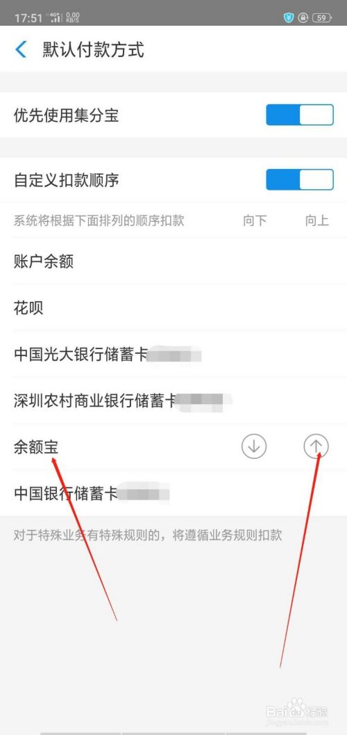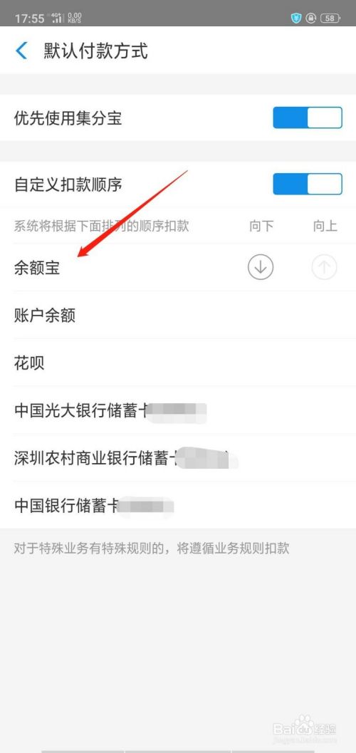 比方说:我要用“余额宝付款”,我就先点击“余额宝”,再点击后面的向上箭头,把他移到第一个。