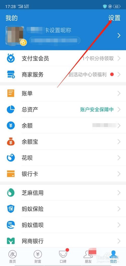 首先我们打开支付宝,进入界面,点击“我的”进入。再点击右上角的“设置”进入。