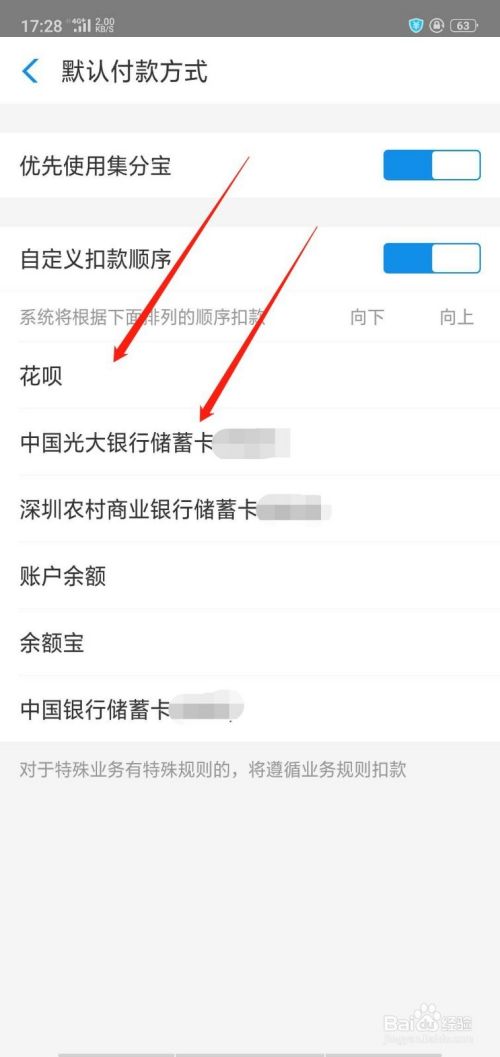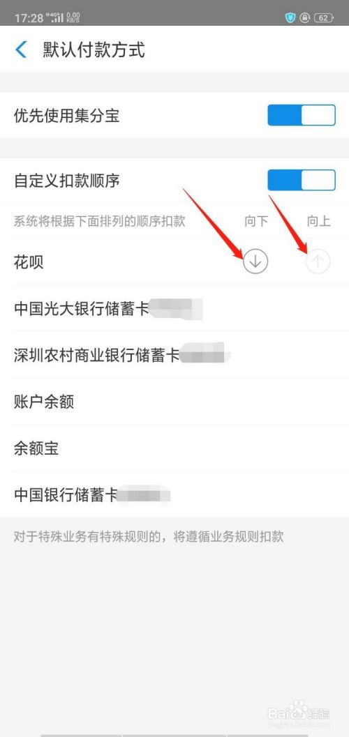 点击你想要的付款方式,点击后会显示有2个箭头,一个向上,一个向下,点击向上的箭头,把它移到第一个就可以了。