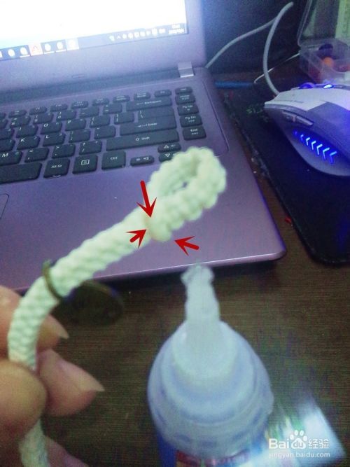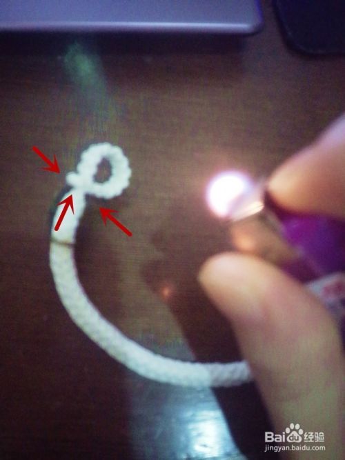 编织一次平结之后,将多余的线头用剪刀剪掉,并运用打火机火烤收结,觉得不够稳固可用强力胶水点涂在绳头上,以再次固定绳结尾结,绳结猴子拳的固定绳圈也就做好了。
