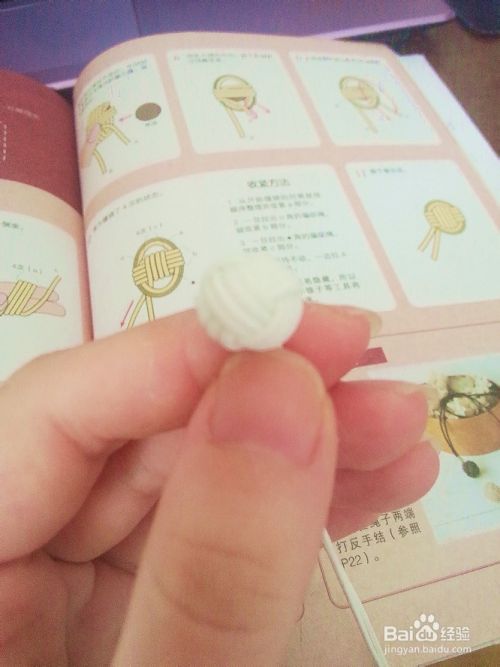 将手指从绳结中抽出,中间放入一颗串珠,作为绳结的圈心绳,便可取下流苏针了。