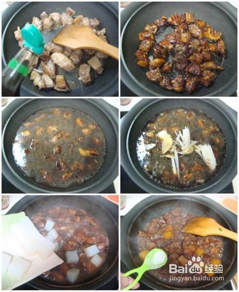 5锅内注油,放入冰糖烧至融化呈微红色。