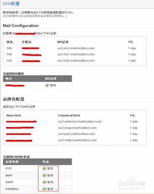 这个页面显示出当前域名的MX记录和CNAME记录解析是否生效了,红圈中“打勾符号 有效”即为解析正确,记录生效;如果是打叉,就要去检查一下域名的MX记录和CNAME记录是否添加正确以及记录是否生效。