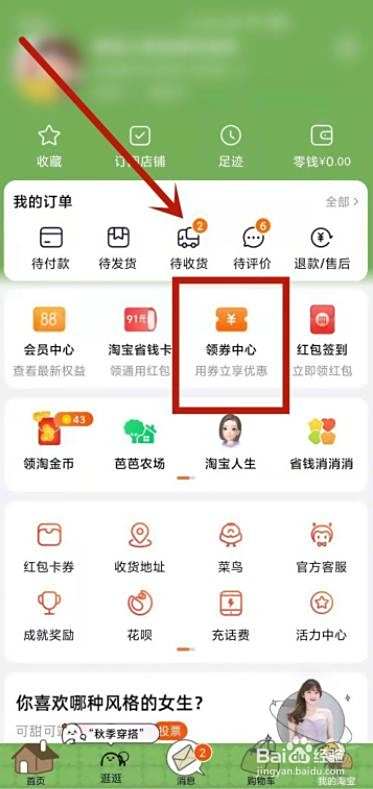 进入淘宝我的淘宝页面,找到领券中心进入。拒欠