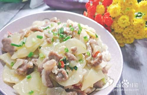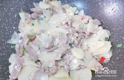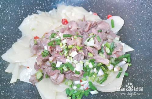 最后把炒好的肉片回锅,放少许盐和半碗淀粉水,葱花,鸡粉,翻炒均匀即可。