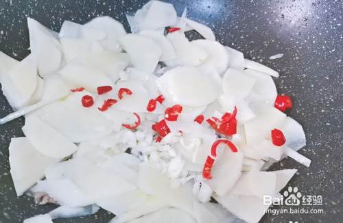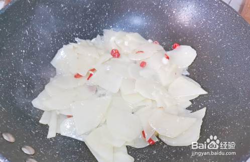 接着把土豆片和辣椒,大蒜都放入锅,大火爆炒一分钟。把土豆片炒软即可。