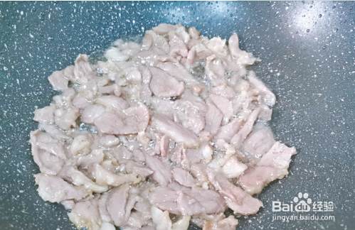 锅涮干净,小火烧六成热时,放入适量花生油,先放肉片大火爆炒至九成熟再铲出来备用。