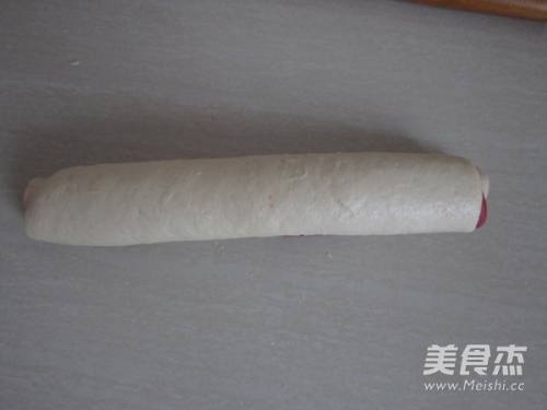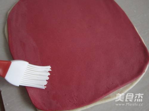 4将咸味叠在甜味面片的上面用涮子涮上清水且将面片紧紧的卷起。