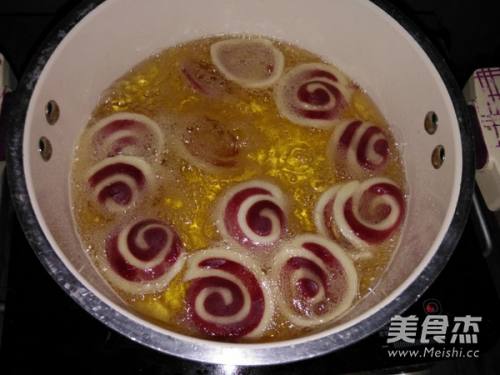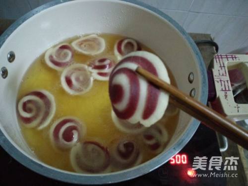 7热锅下油,小火加热,放入筷子有小泡泡包围就可以把面片下锅小火慢炸。