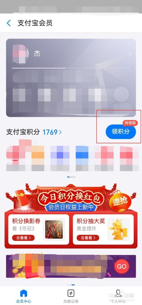 进入支付宝会员页面后,点击中间的“领积分”。