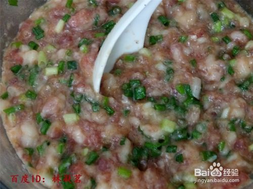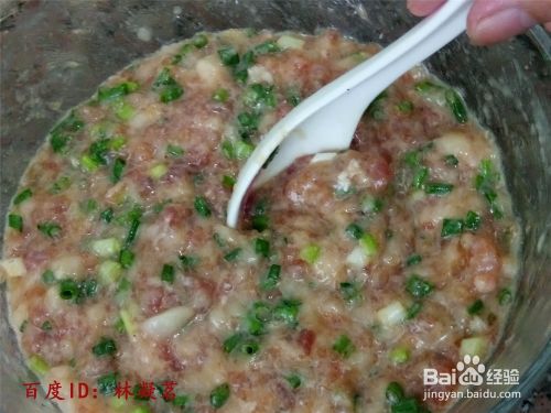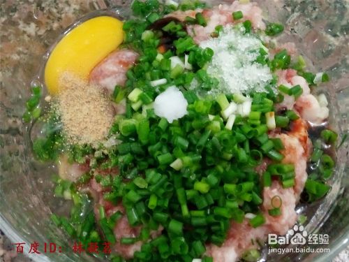 再把葱末加入肉泥里,接着加入生粉,蚝油,胡椒粉,盐,白糖,生抽,麻油。再打入一个鸡蛋。