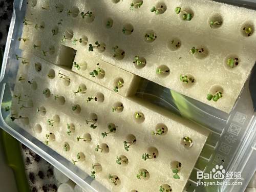 又过了两天,小苗开始慢慢变绿,长大了,发现种植棉干燥就加一厘米深的稀释的营养液,一般可以过三四天再去查看状况。总体感觉还是比较省心的。