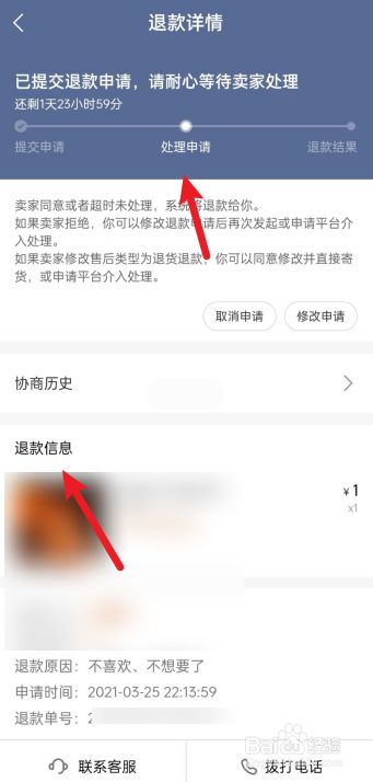 退款申请提交后,一个小时内退款到账,如下图,点击订单……退款详情,可以查看退款的情况。