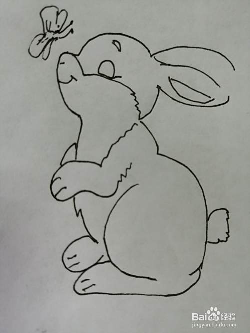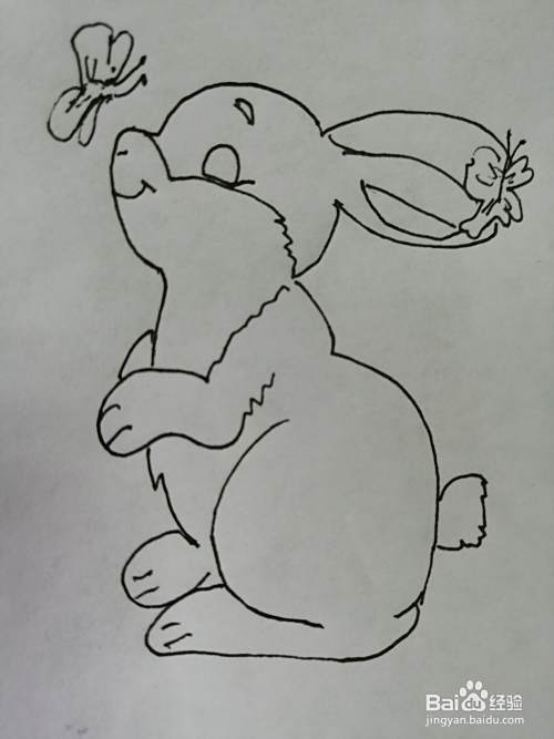 第七步,最后在可爱的小兔子的鼻子何耳朵上画出漂亮的蝴蝶。玩蝴蝶的小兔子刘画好了。