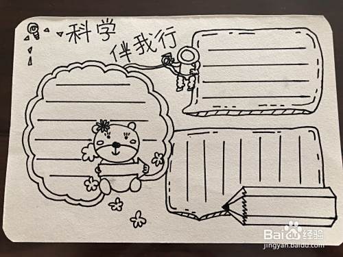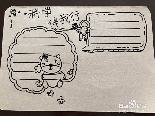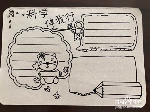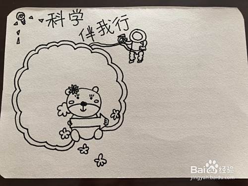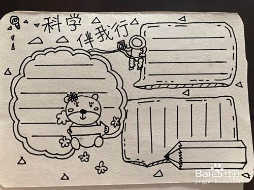 第二个步骤,我们需要把这个边框继续给他画出另外的一层一共有两层之后,我们在用出一些的笔把标题写出来,一共五个字科学伴我型旁边加一些关于科学的一些小标志啊如图所示,小明画的是宇宙的一个人宇航员以及一些小灯泡等等。