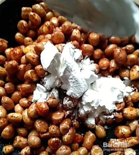 花生米表面都裹上一层淀粉,锅内放油;
