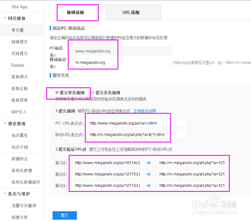 下图以规则适配—单条规则为例,根据上面的需求进行填写。主要该注意的为,url表达式,(/w+)和(/d+)等,可以参考正则表达式规则,进行一一对应填写。其中提交的url对,最好是收录和排名较好的页面,有助于规则的匹配成功。