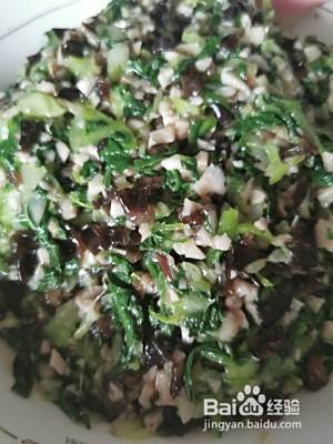 放入油和调料,5分钟蒸汽反转小勺炒香。炒好放凉后放入挤干水份的青菜,洒一点白胡椒粉30秒反转速度2混合,搅拌均匀。