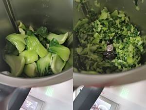 烫软的青菜冷水里捞起挤干水份,点开磅秤放入主锅称500克,设置5秒速度5切碎。挤干水份备用