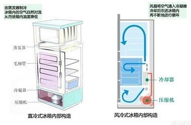 无霜冰箱:无霜冰箱有两种结构,一是指风冷式结构,有自动除霜装置,使用方便,冷藏室降温速度快,箱内温度均匀,食品冷藏质量好, 但冷冻室冻却速度比直冷冰箱慢,耗电量大,价位较高。比较适合空气湿度较大的沿海、长江沿岸及以南地区使用。二是指风直冷混合式冰箱,综合了风冷和直冷冰箱的优点,冷藏室为直冷式,食物水分不易流失,冷冻室为风冷式,耗电相对普通风冷式较低,价格相对更贵。